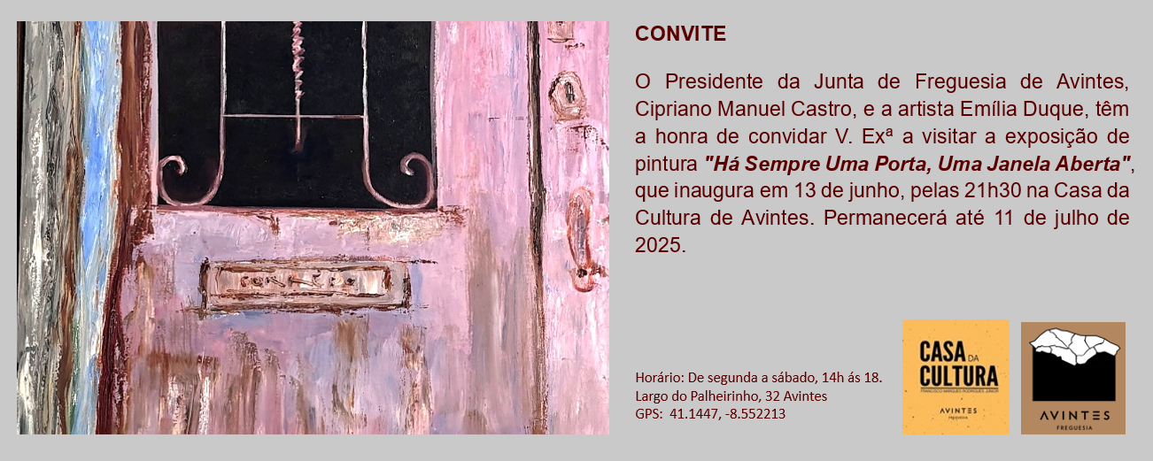 Casa da Cultura de Avintes 13 de junho a 11 de julho de 2025 Apresentação: Emília Duque. Porto. Portugal. A cidade invicta é o meu berço. Cresci no Porto. Casada e mãe de duas filhas. Trabalhei como comercial e administrativa numa Indústria de Tintas e Vernizes. Desde muito cedo, tive o interesse pela arte, no […]