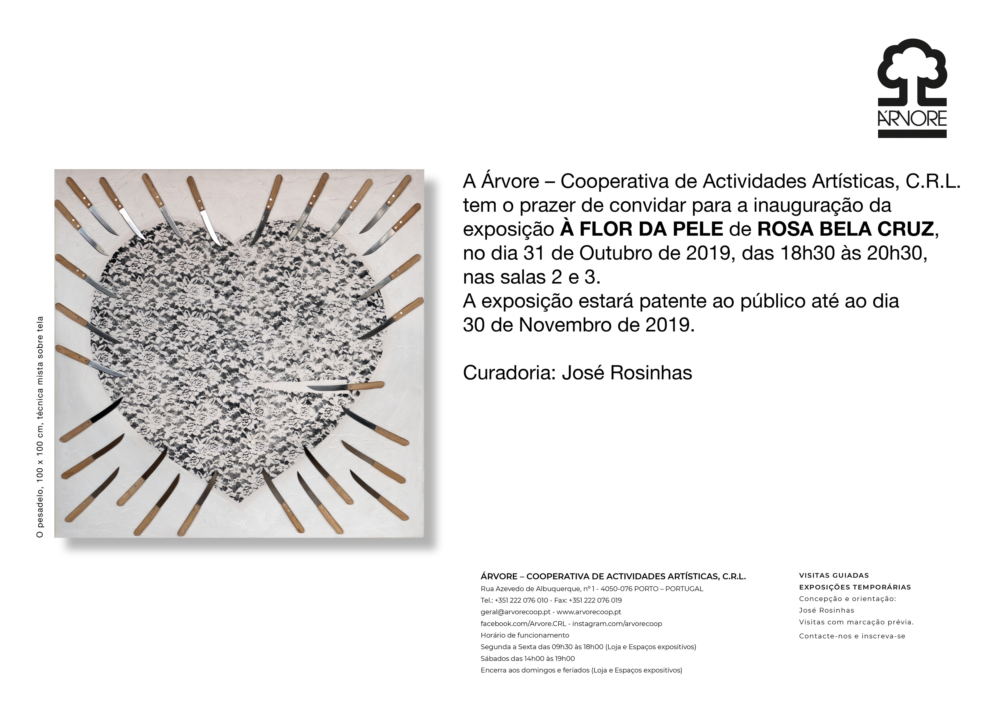 A Árvore – Cooperativa de Actividades Artísticas, CRL tem o prazer de convidar para a inauguração da exposição “À FLOR DA PELE” de Rosa Bela Cruz, no dia 31 de Outubro de 2019, das 18h30 às 20h30, nas salas 2 e 3.