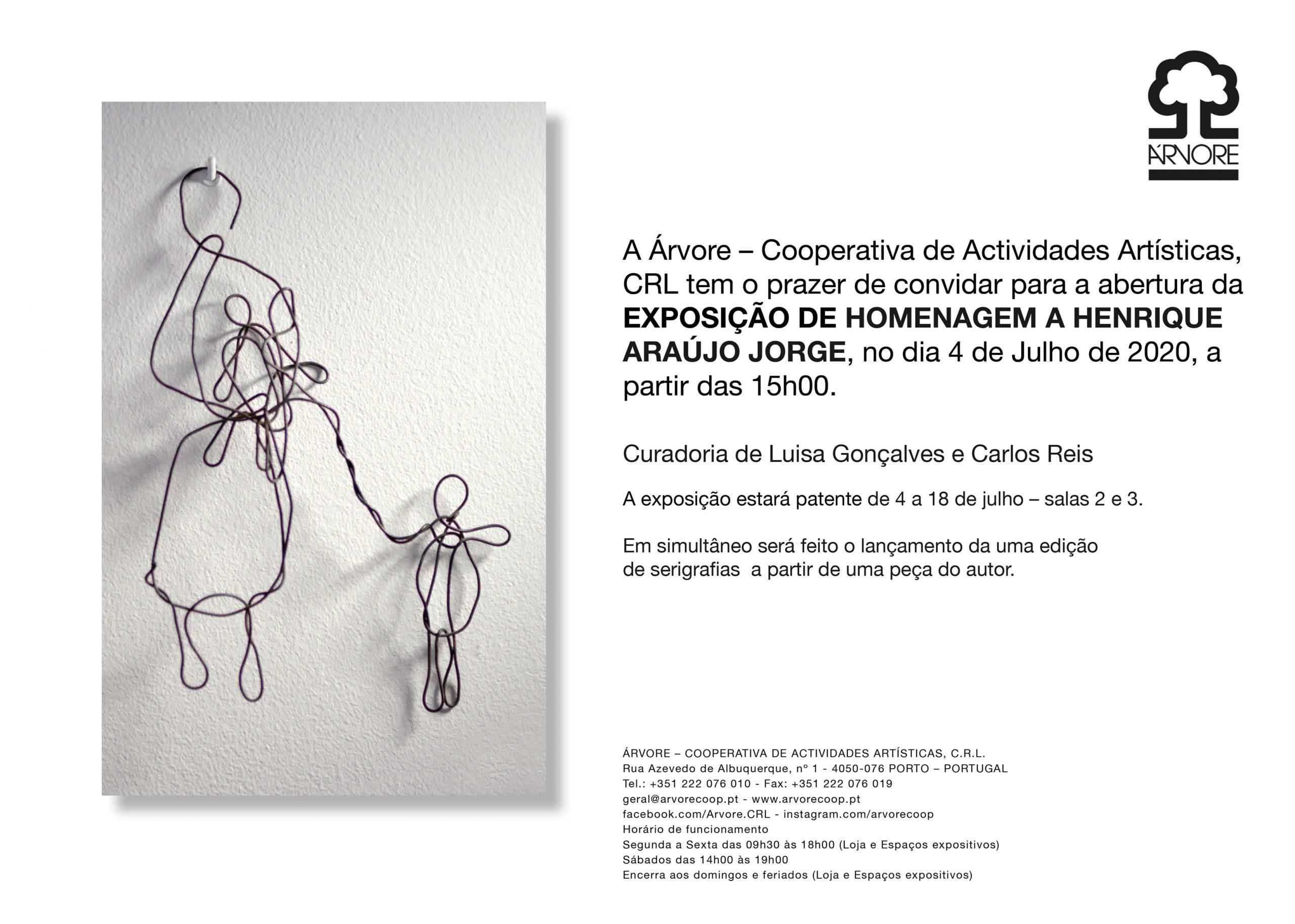 A Árvore – Cooperativa de Actividades Artísticas, CRL., tem o prazer de convidar para abertura da EXPOSIÇÃO DE HOMENAGEM A HENRIQUE ARAÚJO JORGE, no dia 4 de Julho de 2020, a partir das 15h00.