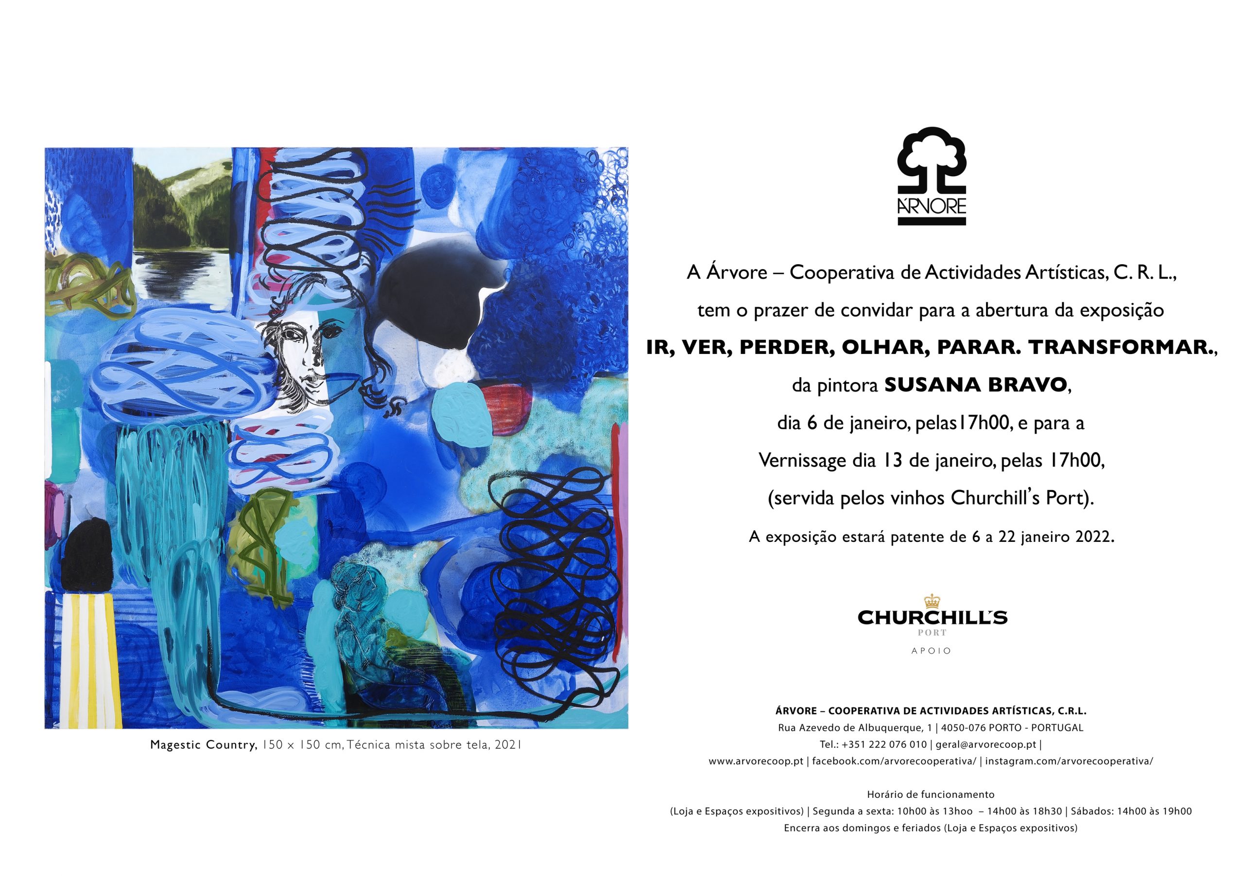A Árvore – Cooperativa de Actividades Artísticas, C.R.L., tem o prazer de convidar para a abertura da Exposição “IR, VER, PERDER, OLHAR PARAR., TRANSFORMAR.,” da Pintora Susana Bravo, dia 6 de Janeiro, pelas 17h00, e par a Vernissage do dia 13 Janeiro, pelas 17h00, (Servida pelos Vinhos Churchill´s Port).