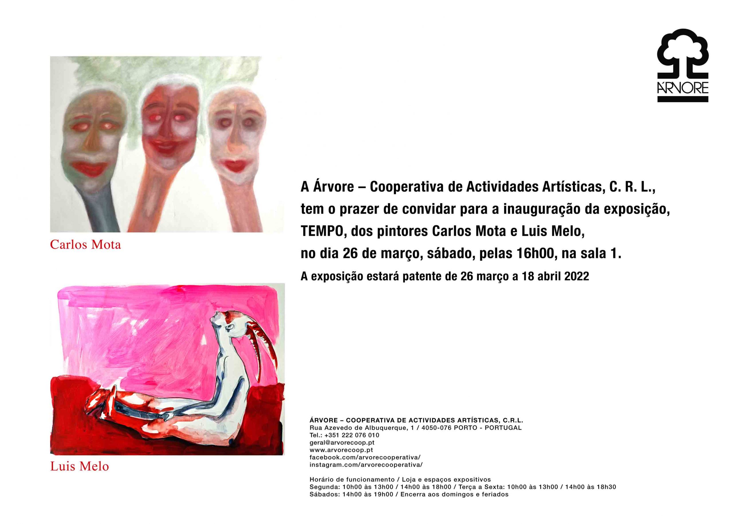 A Cooperativa Árvore tem o prazer de convidar para a abertura da Exposição “Tempo” dos pintores Carlos Mota e Luís Melo no dia 26 Março, Sábado, pelas 16h na sala 1.