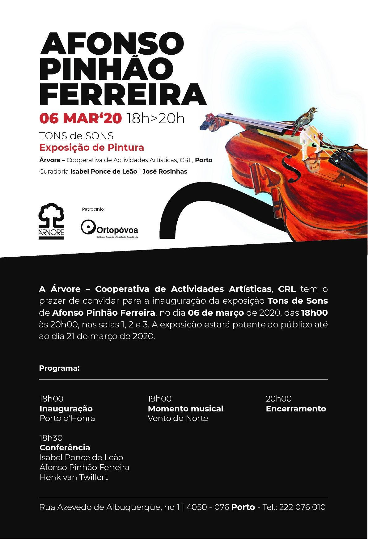 A Árvore – Cooperativa de Actividades Artísticas, CRL., tem o prazer de convidar para a inauguração da exposição Tons de Sons de Afonso Pinhão Ferreira, no dia 06 de março de 2020, das 18h00 às 20h00, nas salas 1, 2 e 3. A exposição estará patente ao público até ao dia 21 de março de 2020.