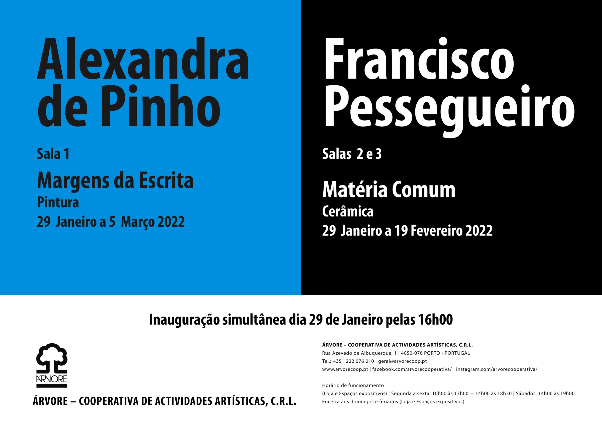 Inauguração simultânea da Exposição de Alexandra de Pinho e Francisco Pessegueiro no dia 29 Janeiro 2022 pelas 16h00.
