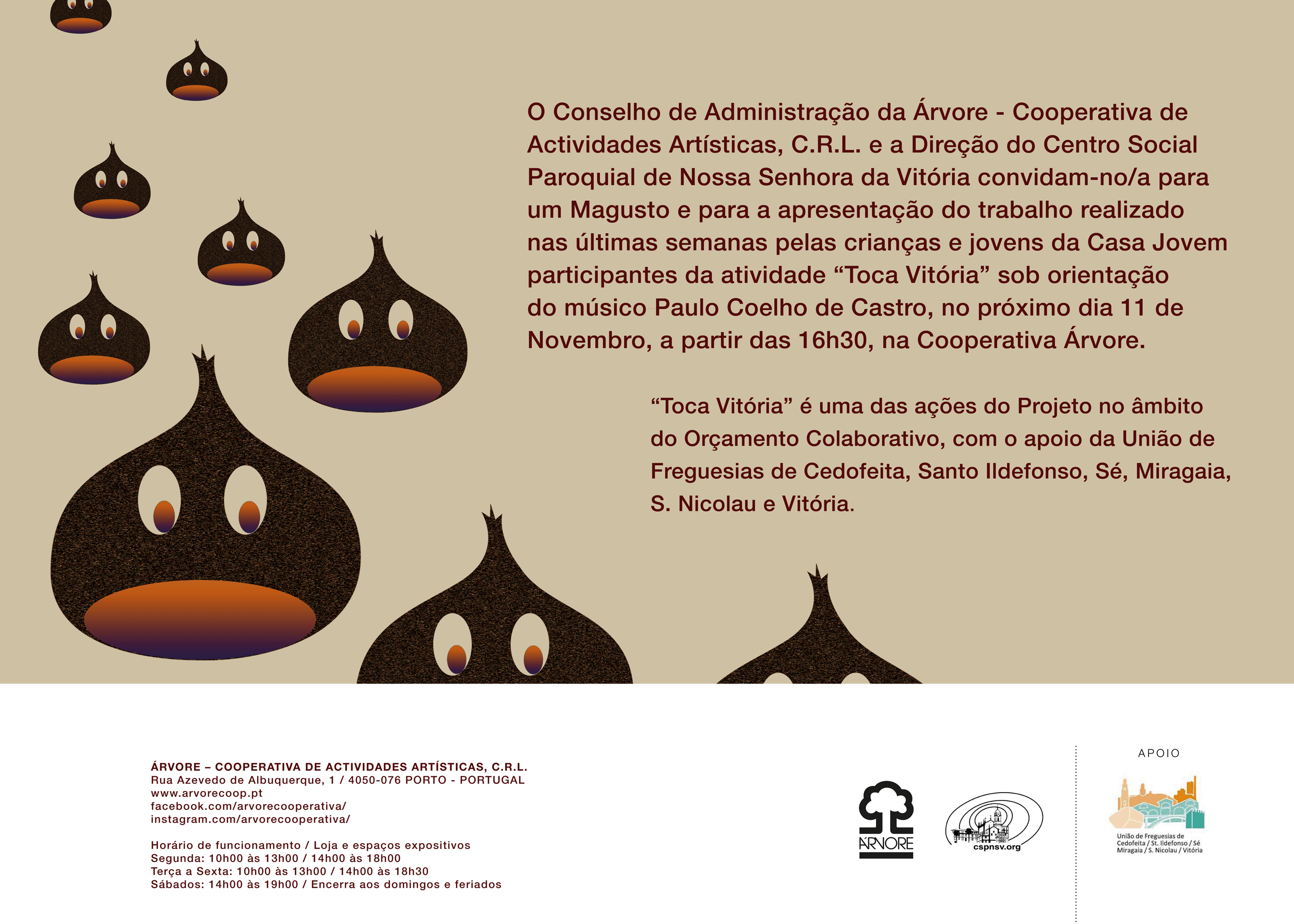 O Conselho de Administração da Árvore – Cooperativa de Actividades Artísticas, CRL., e a Direção do Centro Social Paroquial de Nossa Senhora da Vitória cónvidam-no para um Magusto e para a apresentação do trabalho realizado nas últimas semanas pelas crianças e jovens da Casa Jovem participantes da actividade “Toca Vitória” sob orientação do músico Paulo Coelho de Castro, no próximo dia 11 de Novembro, a partir das 16h30, na Cooperativa Árvore.